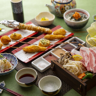 界隈で一番おしゃれな串揚げ店を目指しています! 料亭の風格さえある空間でリーズナブルに串揚げ、しゃぶしゃぶを。 大阪府下で、ほとんど取り扱いがない『六白黒豚』使用しています。 ◆名物の串揚げ/しゃぶしゃぶ ・ラード油を使用しない上品な味わいの串揚げ。 「蟹爪」「おもちのあられ揚げ」など多彩。 ...View More »