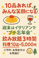 ★★ありがとう!開業20周年記念忘年会 ★★ 【★今年は早目の忘年会受付中★】 そろそろ忘年会の準備は如何ですか? 12月は飲み会シーズン【貸切】予約はお早めに 勿論昼間でもOK! ★お子様込の人数でも貸し切り相談【受付中!】 スパークリングワイン含む3時間飲み放題付きコース ⇒大好評につき継...View More »
