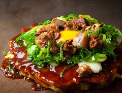 店仕込みの出汁と、シャキシャキ手切りキャベツが自慢のお好み焼きは、外はサクッと中はふわふわ!オリジナルソースと自家製マヨネーズをたっぷりかけてお召し上がり下さい。View More »