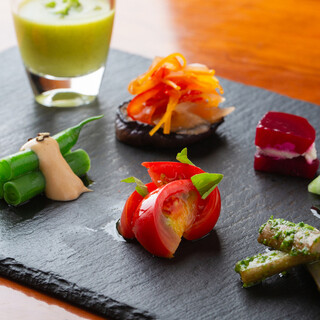 ◆本格フレンチを贅沢に味わう フランス料理のエッセンスをベースに、 野菜ソムリエが織りなす 感性豊かなイノベーティブフレンチをご提供しております。 おまかせコースでは、契約農家さんの新鮮野菜を使用した前菜や、 宮崎県産黒毛和牛の炭火焼、 野菜ソムリエが厳選したお野菜のデザートなど 11品ほどご...View More »