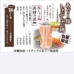 上質な豚肉アグーにきくらげを巻いていただく独自の「アグーしゃぶしゃぶ」を始め、 定番のゴーヤーチャンプルーやラフテー、ヒラヤーチーなど沖縄料理を多数取り揃え。 その日の仕入れによって内容が変わるお刺身盛り合わせもございます! 焼酎をはじめ、日本酒や沖縄泡盛など、お酒の種類も豊富にご用意♪県産食...View More »