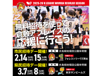 2月14日15日、3月7日8日に開催されるホームゲームを無料招待。「無料招待を使って、倉敷アブレイズの応援に行こう!」 倉敷アブレイズは、202526シーズンのホーム最終4試合に向けて実施する...