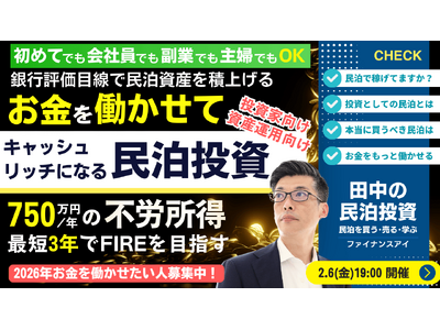 2/6(金)民泊セミナー開催。会社員・公務員・40代・50代でも3年で年間750万円の不労所得を得るFIREを目指せる!収益化済みの"稼ぐ民泊事業"を銀行評価目線で買う。不動産投資の頭金も稼げると人気