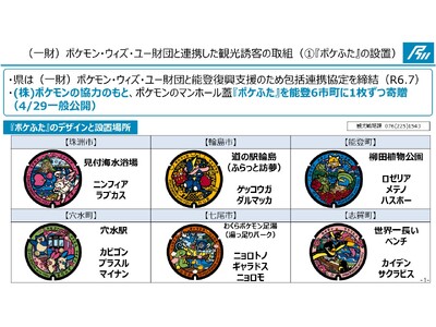 (一財)ポケモンウィズユー財団(ポケモン財団)の仲介のもと、(株)ポケモンより『ポケふた』(ポケモンデザインが描かれたマンホール蓋)を能登6市町に1枚ずつ寄贈いただき、4月29日から一般公開し...
