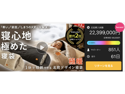 クラウドファンディングMakuake開始4日で2,200万円超え。冬キャンプ、スキー・スノボー車中泊から、来客用の布団にまで使える、「極暖」北欧デザインの寝袋「ヒュッゲスリープ Deluxe」!