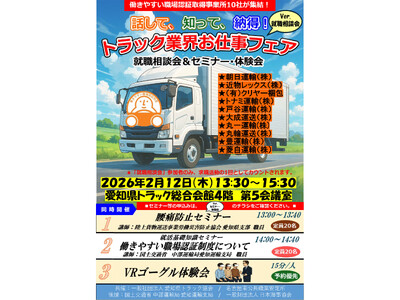 話して、知って、納得!「トラック業界お仕事フェア」 2026年2月12日、働きやすい職場認証取得事業者10社が参加する就職説明会&セミナー体験会が、一般社団法人愛知県トラック協会名古屋...