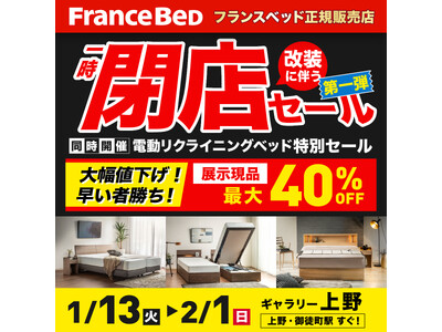 【店内最大40%OFF】1/13(火)~2/1(日)限定/ベッド&家具『一時閉店セール』開催@上野!ー ビッグイベントでお買い得。エリア最大級*展示。