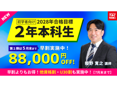~本試験網羅率95%超の教材と、姫野寛之講師プロデュースの戦略的カリキュラム~ TAC株式会社は、2026年4月1日(水)より、2028年度の司法書士試験合格を目指す初学者向けコース「2年本科...