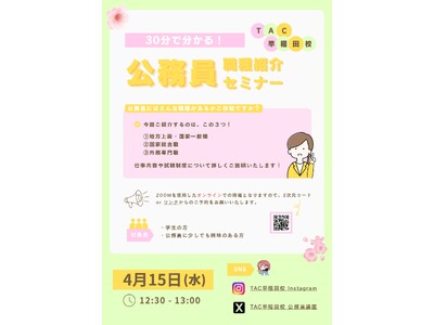 TAC早稲田校から配信します! 資格取得に向けた教育サービスを展開しているTAC株式会社(東京都千代田区)では、公務員試験を検討されている皆様へ向けて「30分で分かる!公務員職種紹介セミナー」...