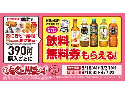 春の新生活シーズンにうれしい"実質値引き"企画 おにぎり・寿司・店内調理の揚げ物各種を税込390円購入ごとに、対象の飲料無料券プレゼント! 2026年3月18日(水)より2週間実施