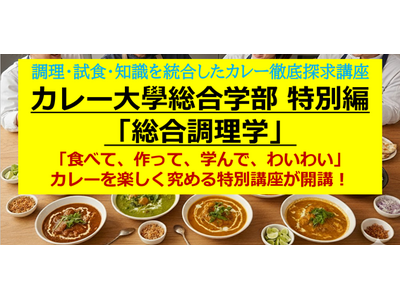 【3つの注目ポイント】1.10種類以上のカレー実習&試食の体験する前代未聞のプログラム、2.7時間でカレー専門家になる調理×歴史×商品学を統合した総合カレー講座、3.認定資格「カレー伝...