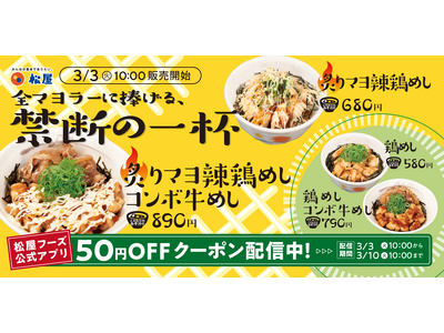 マヨネーズ×辣油×鶏肉の最強タッグ! 炙りの香ばしい鶏肉が美味しさを加速する、背徳エナジー飯 3月3日(火)10時~ 販売開始 このたび松屋フーズ(本社:東京都武蔵野市、代表取締役社長:瓦葺一...