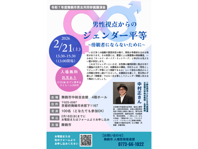 男性視点からジェンダー平等を自分事として考える 舞鶴市は、令和8年2月21日に中総合会館にて、「令和7年度男女共同参画講演会」を開催します。講師に、一般社団法人UNLEARN代表理事/立命館大...