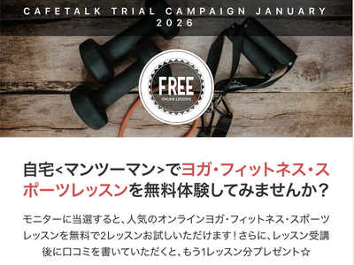 最大9,000円分を無料で!「今年こそ運動を習慣に」をプロが支援!カフェトークがヨガ・フィットネスの特大モニターを募集。当選者は2回無料+口コミでもう1枚チケット進呈!