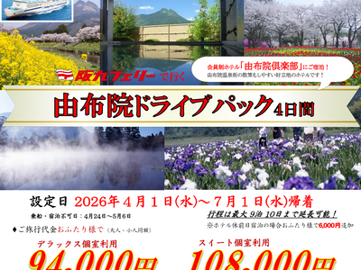 旅行企画実施 株式会社ヴィーナストラベル 2026年4月~6月のご出発で、兵庫神戸六甲アイランド港もしくは大阪泉大津港から出港し、 会員制ホテル「由布院倶楽部」に宿泊できる「由布院ドライブパッ...