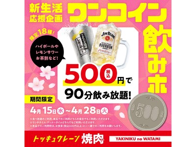 【焼肉の和民】衝撃のワンコイン!新生活応援企画!18種の対象ドリンクが"税込500円"で飲み放題!「ワンコイン飲みホ」キャンペーンを4月15日(水)より4月28日(火)まで期間限定で開催!