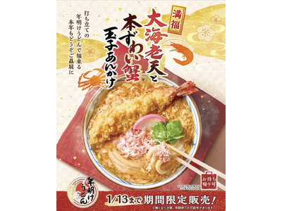2026年初うどんは、丸亀製麺でめでたい 「年明けうどん」を! えびと蟹、豪華な食材を打ち立てうどんに絡めて 『大海老天と本ずわい蟹の玉子あんかけうどん』