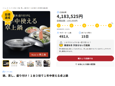 多くの応援が集まった注目企画、『鍋、蒸し、盛り付け!1台3役で1年中使える卓上鍋』プロジェクトが歴代応援額1位を更新いたしました。 プロジェクト概要プロジェクト名:鍋、蒸し、盛り付け!1台3役...