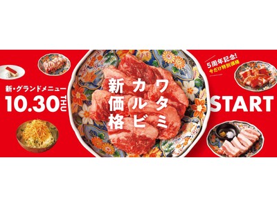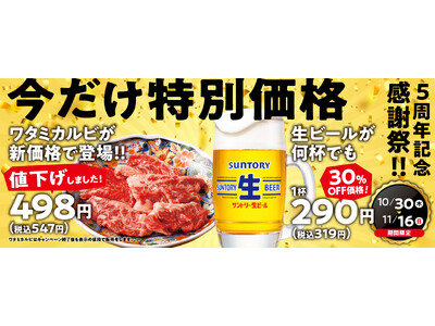 【焼肉の和民】2025年10月30日(木)から新グランドメニューの販売スタート!焼肉の和民5周年記念 感謝の特別価格「ワタミカルビ値下げ価格」で販売