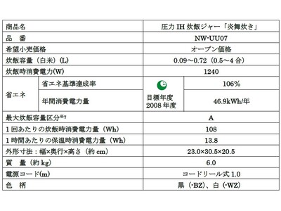圧力IH炊飯ジャー「炎舞炊き」(NW-UU07)新発売