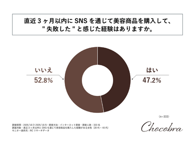 直近3ヶ月以内にSNSを通じて美容商品を購入した経験がある女性の半数弱が、SNSを通じて美容商品を購入して"失敗した"と感じた経験がある!