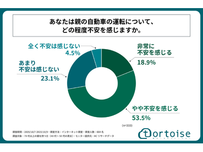 株式会社トータス(本社:神奈川県大和市、代表取締役社長:村野 公紀)が運営する「tortoise」は、70代以上の親を持つ40代~50代の男女を対象に親の自動車免許の返納に関する子世代の意識実...