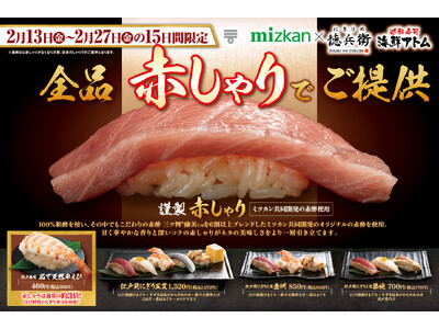 15日間限定!全品《謹製 赤しゃり》でご提供!通常の約3倍の大きさ!?江戸時代のにぎり寿司を再現!!2月13日(金)よりにぎりの徳兵衛・海鮮アトムにて登場