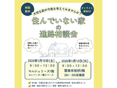 住んでいない家の進路相談会:地域で眠っている不動産の利活用促進を目指します 公益財団法人うんなんコミュニティ財団(島根県雲南市、代表理事 郷原剛志)は、2026年1月10日及び1月13日に[住...