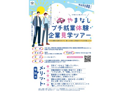 山梨県(知事:長崎幸太郎)は、山梨県内に本社または事業所を有する企業でのインターンシップや就業体験を通じて、県内大学生等の県内就職や県出身大学生等のUIターン就職を促進するため、受入企業と学生...