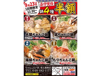 9月23日(火・祝)1日限定!「ちゃんこ江戸沢」埼玉新座店 ちゃんこ鍋4種半額!