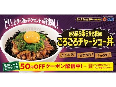 にんにく背脂醤油の旨味に、ピリッと辛いラー油がアクセント。 ごろごろチャーシューを豪快に味わう松屋流"背徳飯"! 9月23日(火)10時~ 販売開始 このたび松屋フーズ(本社:東京都武蔵野市、...