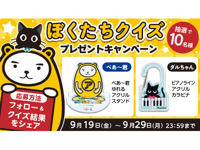 抽選で10名様に「べあ~君 揺れるアクリルス」&「ダルちゃんのピアノライン アクリルカラビナ」を進呈 賃貸住宅仲介業店舗数No.1¹のApaman Network株式会社(本社:東京都...