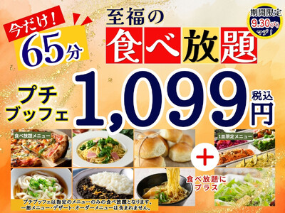 【食欲の秋!!1,099円で至福の65分食べ放題!!】9/30迄!大好評企画開催!‟ニラックスブッフェ"で人気の45分の食べ放題コース『プチブッフェ』を『20分』延長!65分の充実の食べ放題をご堪能あれ!
