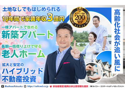 少子高齢化で注目が高まる"住宅から介護へ"の不動産投資。土地なしでも始められる老人ホーム×新築アパート投資の考え方を、平日夜の無料セミナーで公開 30年長期一括借上で安定収益を目指す「老人ホー...