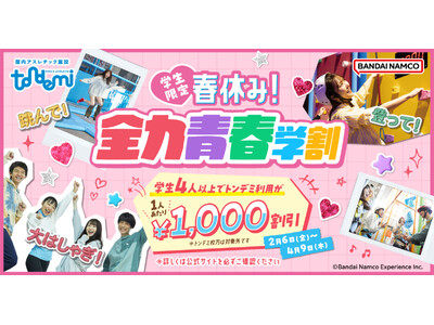 株式会社バンダイナムコエクスペリエンスが企画プロデュースする屋内アスレチック施設『トンデミ』の対象店舗(※1)にて、2026年2月6日(金)~4月9日(木)の期間、「春休み!青春全力学割」を実...