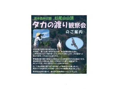 9月28日(日)清水森林公園では、園内の杉尾山にて「タカの渡り観察会」を開催します。参加費は無料です。この機会に是非!長い旅路に向かうタカ達を見送りませんか? 「清水森林公園内杉尾山 タカの渡...