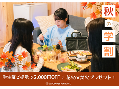 ウッドデザインパーク与位(兵庫県宍粟市)では、学生旅行を応援する「学割プラン」を実施中。秋限定で焚火or花火の選べる特典プレゼントいたします。 秋の学割限定の選べる特典プレゼントウッドデザイン...