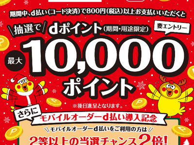 やよい軒でのd払い決済がチャンス!d払い利用でやよい軒にて最大10,000ポイントがあたる!
