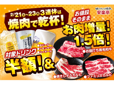 【3連休は"焼肉で乾杯"を最高に楽しむ】安楽亭2月21日~23日まで生ビール・レモンサワー・ハイボールが半額&「ファミリーカルビ」や「焼きしゃぶカルビ」「お値打ち黒毛和牛」がお値段そのまま1.5倍!