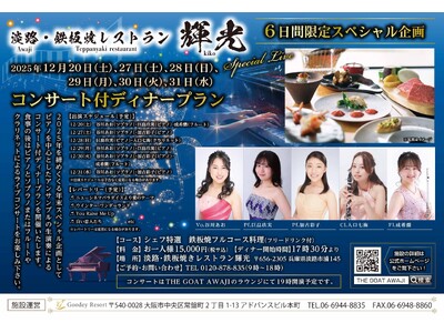 「THE GOAT AWAJI」×「淡路鉄板焼レストラン輝光」が贈る、クリスマスディナープランとコンサート付きディナープランの2つの贅沢プランを期間限定で発売