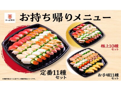 【かっぱ寿司】お持ち帰り「中とろ、サーモン、いくら」など人気ネタ尽くしでリニューアル!平日お受け取りのみ対象、アプリにてお持ち帰り100円OFFクーポンも配信中!ハレの日やホームパーティー、母の日に!