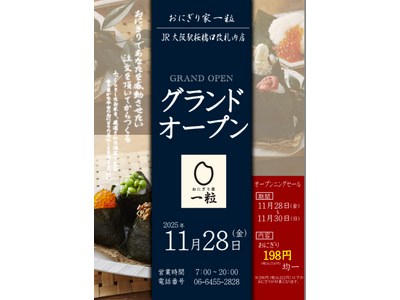 11月28日(金)、JR大阪駅桜橋口改札内に「おにぎり家一粒」がオープンいたします。電車の乗り換え時に気軽に立ち寄れる便利なロケーションで、握りたてのおにぎりをご提供します。 オープニングセー...