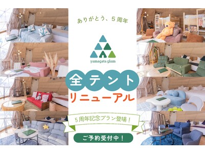 「ありがとう、5周年!」体験型グランピング施設 yamagata glamが全テントリニューアル!もっとゆったり、もっと贅沢に。5周年を祝う"5"にちなんだ特別プランも登場。