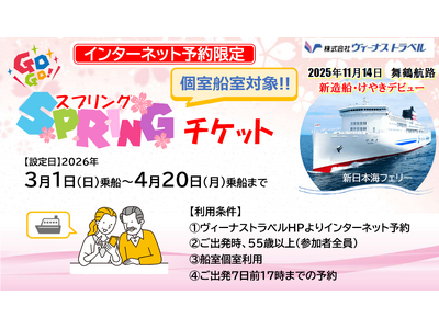 【新日本海フェリー】55歳以上のお客様を対象に個室船室・乗用車がお得に!『GOGO!スプリングチケット』発売