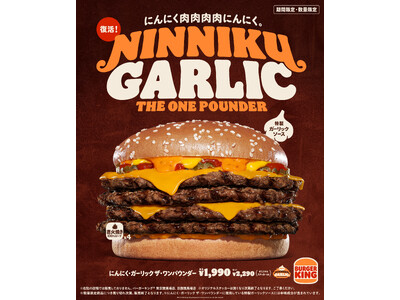 バーガーキング(R) から人気の超大型バーガー『にんにく・ガーリック ザ・ワンパウンダー』が復活!ジューシーな直火焼きビーフパティ4枚に、にんにく3種のパンチが効いた「特製ガーリックソース」が極限の旨さ!