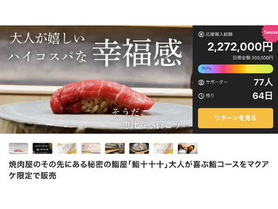 公開直後から怒涛の支援ラッシュ!秘密の鮨屋『鮨 十十十(とみ)』が、Makuakeで"達成率757%"を突破