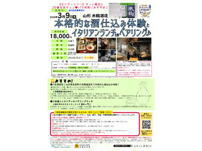 おすすめポイント!10名様限定のモニターツアー!! 山形県高畠町の米鶴酒造 株式会社にて、本格的な酒仕込みを体験 蒸米の枯らし作業、櫂入れによるもろみ仕込み作業などを行う予定です。 当日仕込ん...