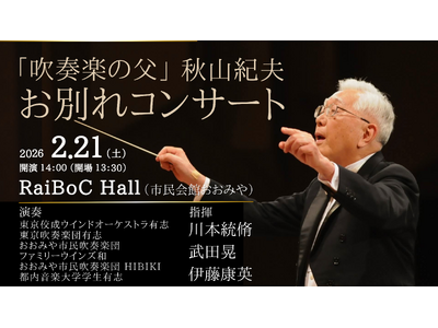 2026年2月21日(土)会場:RaiBoC Hall (市民会館おおみや) 開演14:00 開場13:30 長きにわたり日本の吹奏楽界を牽引してきた秋山紀夫氏(吹奏楽指揮者、教育者)が、吹奏...