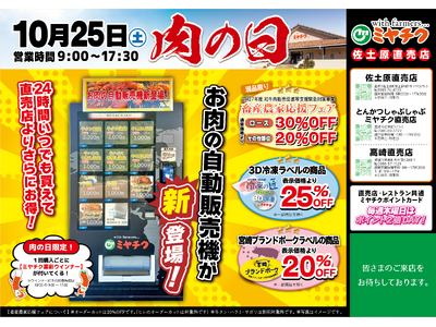 【月に一度の肉の日】佐土原直売店に、お肉の自動販売機がついに登場!秋の味覚・宮崎牛がなんと最大30%OFF!おいしさもお得も、ぎゅっと詰まったこのチャンスをお見逃しなく!