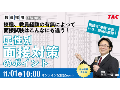【TAC教員採用試験】「校種、教員経験の有無によって面接試験はこんなにも違う!属性別 面接対策のポイント」を11/1(土)配信!